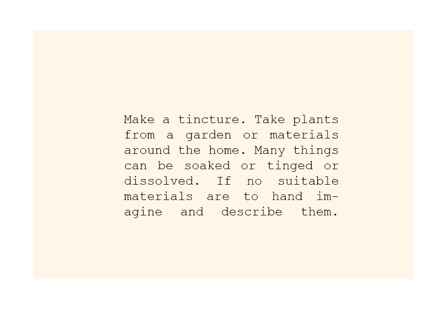 Make a tincture for something you didn’t know you needed. Take plants from a garden or materials around the home. Many things can be soaked or tinged or dissolved. If no suitable materials are to hand imagine and describe them.